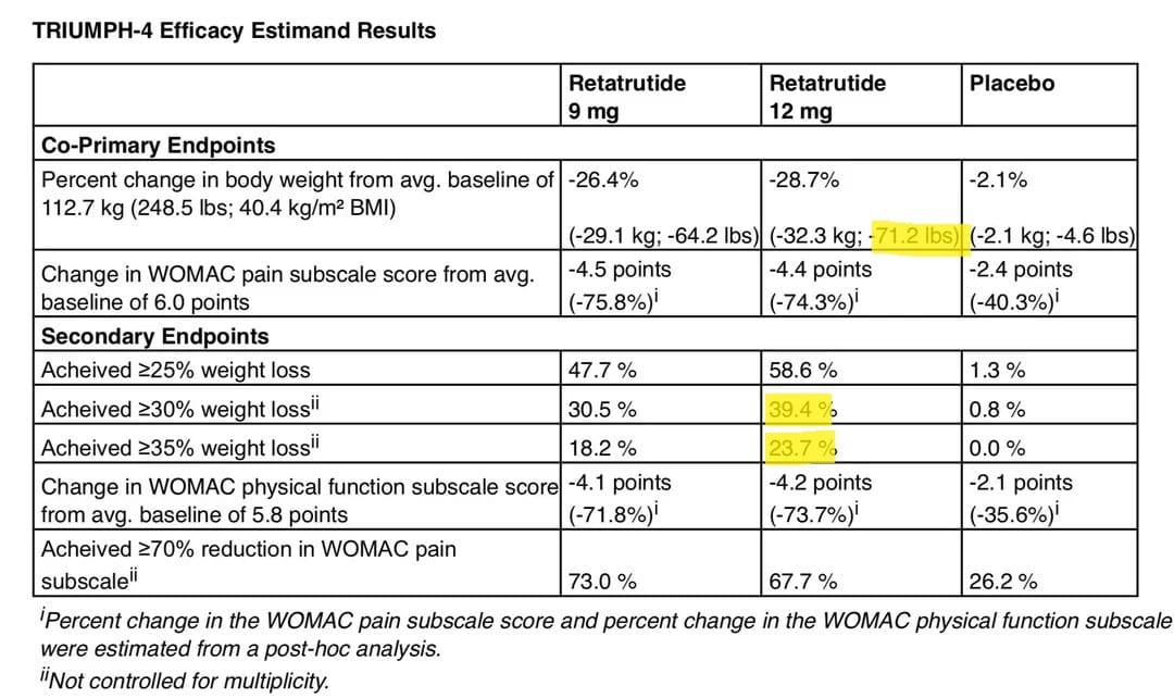 Link to the press release: Lilly's triple agonist, retatrutide, delivered weight loss of up to an average of 71.2 lbs along with substantial relief from osteoarthritis pain in first successful Phase 3 trial | Eli Lilly and Company