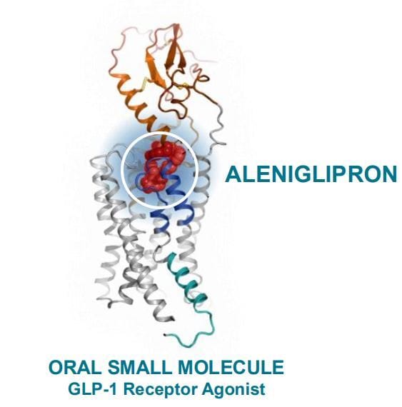 Let’s talk molecule shape first, aleniglipron is what is known in the pharma spaces as a “me too drug.” That is generally understood as targeting the same receptor as a known drug for similar effects, in this case targeting the GLP-1 receptor for treatment of obesity and diabetes. More classic examples would include cholesterol medications(statins), and acid reflux medications (proton pump inhibitors including the notorious examples of omeprazole & esomeprazole back in the 90s and early 00s.)