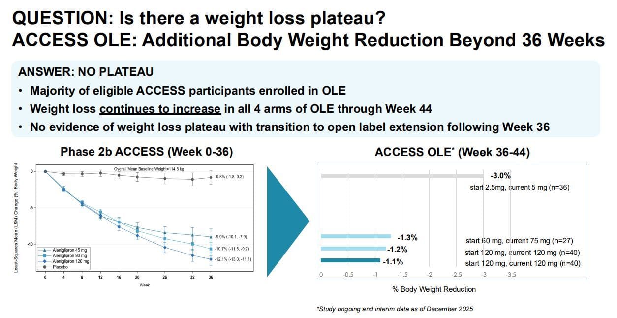In raw numbers these match orforglipron for weight loss but in a much faster timeframe and without a plateau yet at 36 weeks and also with a dose increase at week 36, continued to lose weight for at least another 8 weeks as shown in this slide: