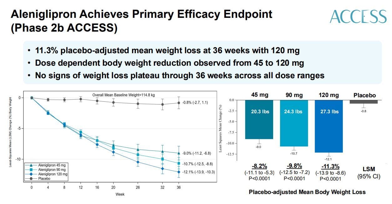 Enter today’s latest drug, aleniglipron by Structure Therapeutics. It is yet another entry in the Tortured Pharmaceuticals Vowels Department(with apologies to Taylor Swift) Funny name aside, these results have been hotly awaited for some time now by those of us in the know(including your author) This is two phase 2b trials called ACCESS. One with ‘standard’ dosing and the other testing higher doses to see if there is any difference in weight loss or side effects.
