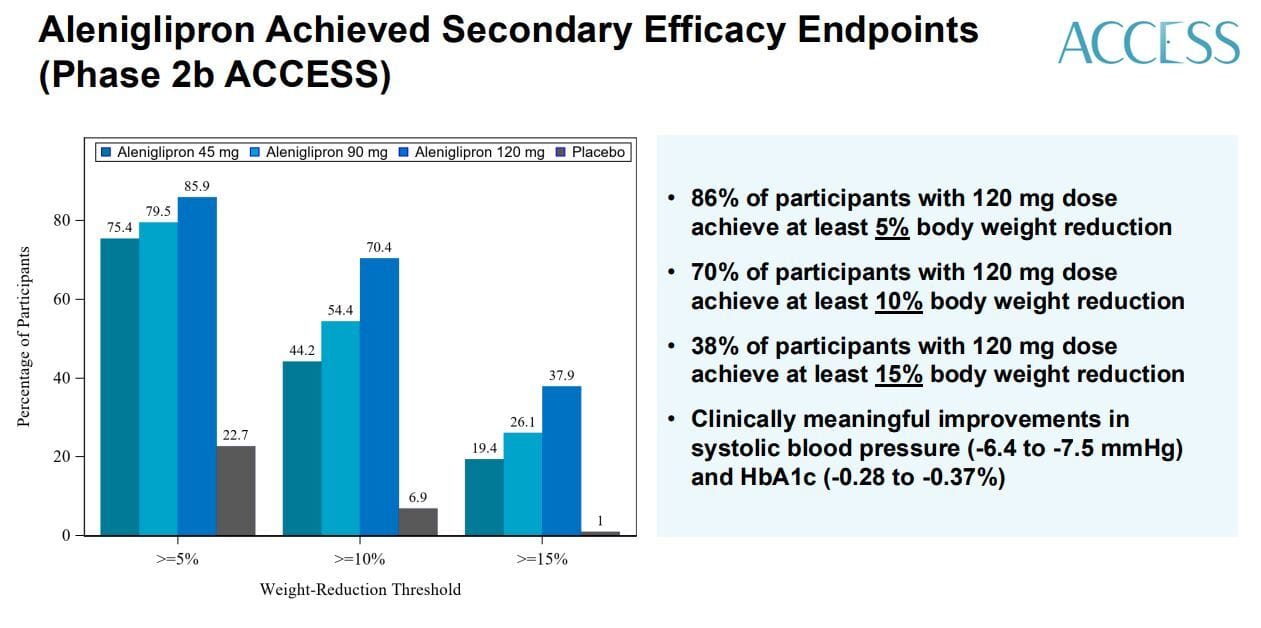 Here’s the weight loss broken down by percent lost, along with a note that aleniglipron reduced blood pressure in line with other GLP-1 agonists: